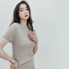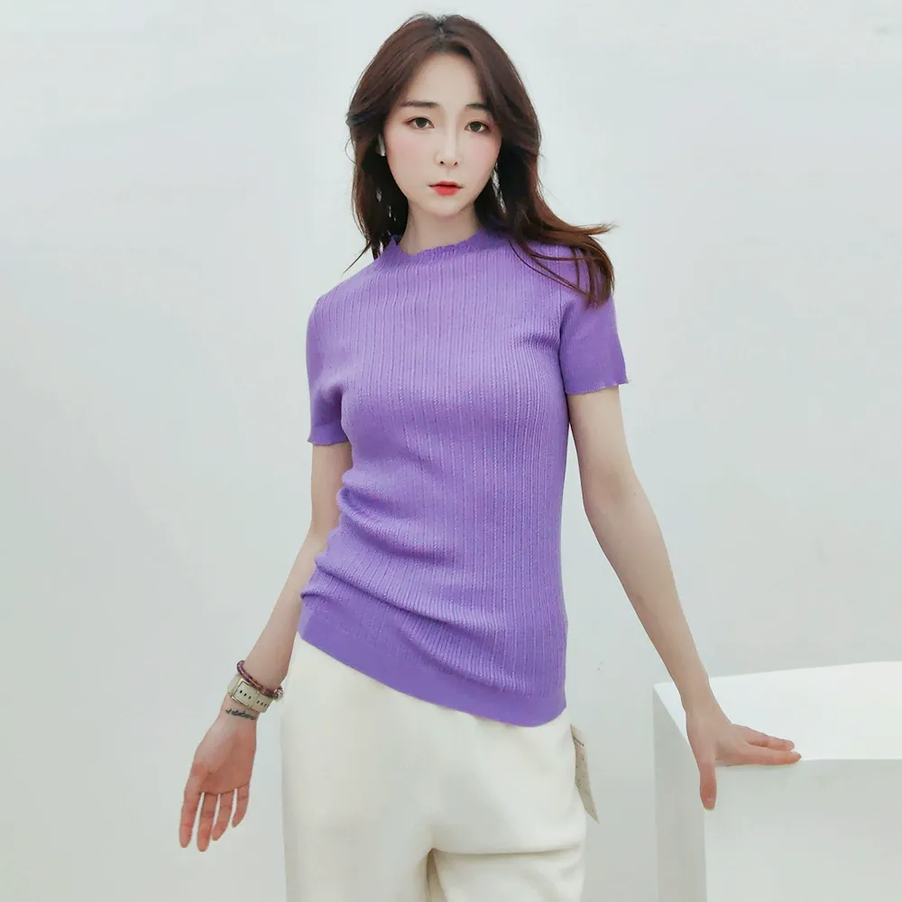 summer new short sleeved slim fit and slimming temperament top made of mulberry silk and wool with a semi high neck and a home style knitted pullover